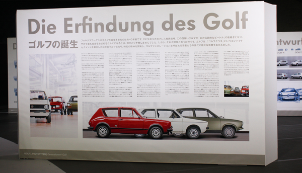 会場の一角にはパネル展示がありました。初代ゴルフの誕生についてのストーリーです。写真の3台は、白が生産型ゴルフで、赤いクルマはフォルクスワーゲンが当時試作したもの、淡い緑のクルマはポルシェ社で開発されて、市販化直前まで行ったモデルです。