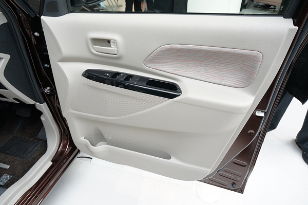 通常モデルの内装は白。明るく、とくにファミリーで乗るには良いかもしれません。ダッシュ前面のパネルがドアに向かって湾曲しており、メルセデスSクラスとか最新のデザイン傾向に沿っている感じですが、上品な印象で、「eK ワゴン」もかなり品がありましたが、さらに、という感じです。