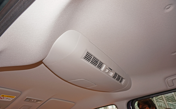 送風ファンの装置部分。エアコンだとダクトをとおす必要があり大変なので、送風のみの機能です。ただ、軽自動車のエアコンのファンは強力でないので、これだけ"部屋"が広くなってくると、こういうファンの追加は効果ありのようです。まさに天井スペースの有効活用ですが、旅客機か観光バスの雰囲気です。