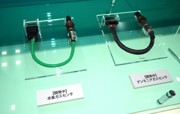 すぐ横に水素ガスセンサーも展示されていました。右横にはアンモニアセンサーも見えていますが、NGKはO2センサーをつくっており、その技術を活かしています。O2センサーは、えびの養殖などで水の管理・調整に用いるのだそうです。ガソリン・ディーゼルの内燃エンジンが淘汰される未来が待ち受けるなかで、そうなったときへの対応をいろいろ進めているようです。