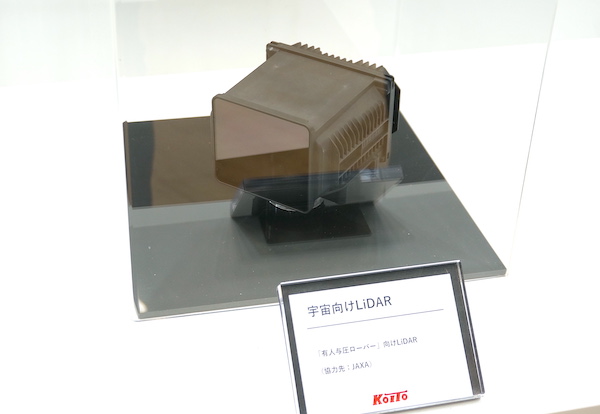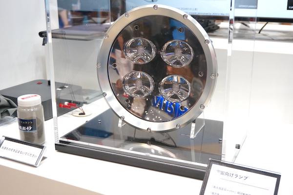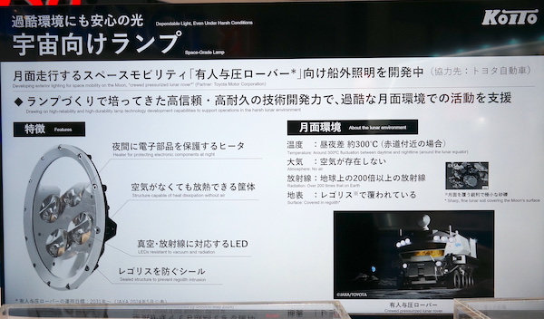宇宙関連技術では、KOITOが、月面車用のランプとLiDARを展示していました。たとえばランプの場合、厳しい温度環境に耐えること、放射線に対応するLED、レゴリスと呼ばれる微細な砂の嵐に耐えるシーリング、などがテーマとのこと。半導体を使う電子部品には対応温度があるので、ヒーターとクーラーを備えています。また、打ち上げには重量あたりで巨額な費用がかかるので(ブースで聞いたのは1kg10億円とか)、軽量化にも心血を注いでいるそうです。