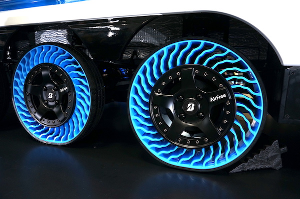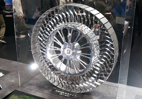 ブリヂストンでは、エアレスタイヤも展示していました。こちらはもちろん“地球用”ですが、この「AirFree」の技術は、月面タイヤにも活かされています。ブースでは、4軸式のスロー走行の小型バスに装着されていましたが、東京・小平のブリヂストンの技術センター周辺の路上で、軽自動車に装着して一般道をふつうの速度でテスト走行(実証実験)も行っているとのこと。だいぶ現実的になってきているようです。