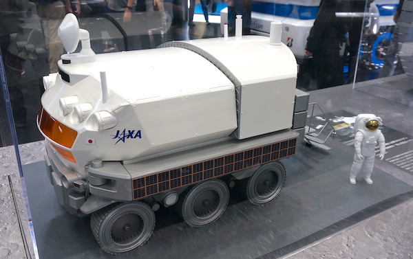これはブリヂストンのブースにあった、月面探査車の模型。ランプやLiDARと思しきものも装着されています。探査車はトヨタが担当しています。月面探査車は2029年の計画だと前回モビリティショーのときに聞きましたが、少し遅れる可能性もあるようです。つい先ごろH3ロケット打ち上げ失敗のニュースがありましたが、今後もいろいろ予定が変わることもあるのでしょう。