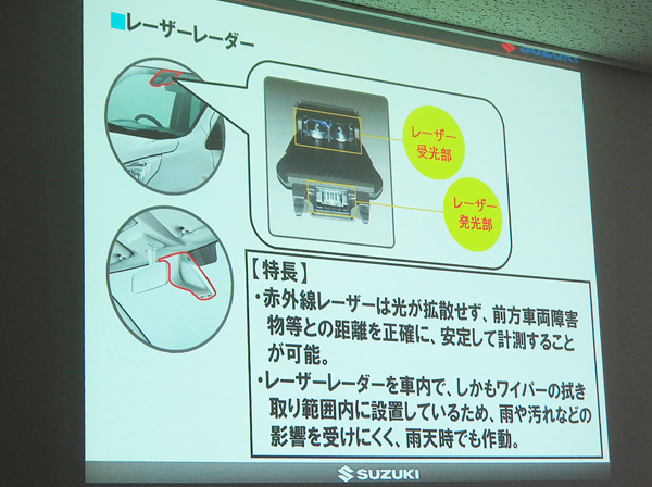 上写真はこれらの機能に使われる、前方検知のためのレーザーレーダーで、ワゴンRではバックミラー部に付きます。この位置は作動性能が安定するそうです。